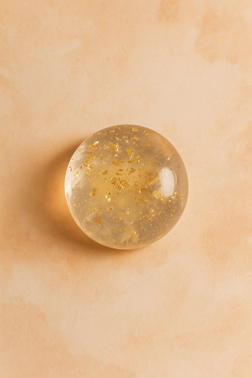 Cada pieza de DUORO 24K Sensory Edition es un jabón transparente, redondo y con abundantes láminas de oro cosmético, que reflejan la luz y otorgan un tono dorado natural, convirtiéndolo en un verdadero objeto de belleza.